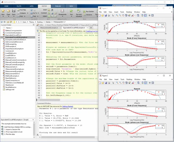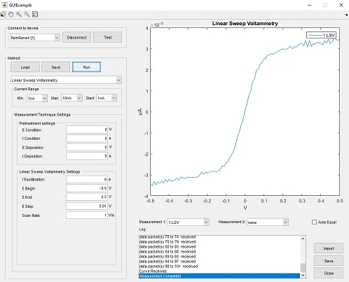 Control your PalmSens instrument using MATLAB Connect to your PalmSens instrument, receive data and plot the results, with a graphical user interface in MATLAB. After selecting the electrochemical technique to use, you can adjust the parameters and start a measurement. |